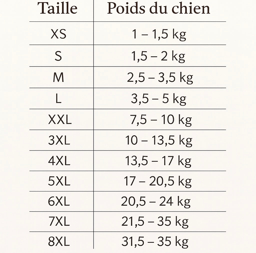 C'est super simple ! Consultez notre guide des tailles intuitif sur la page produit. Mesurez votre chien et trouvez la coupe parfaite qui lui assurera confort, liberté de mouvement et un look impeccable.